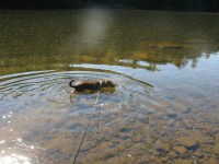 River Trail is 1.7 miles long and is also considered difficult hiking. As you head down towards the river, it is steep in places, but the real challenge was getting a good footing on some of the rocks. They were a bit loose at times and you just had to keep your balance. It didn’t help having a dog pulling you behind him as he was on a mission to get to the river as fast as he could. The trail is lined with Rhodies and Mountain Laurel and would be beautiful in the spring. Once you reach the river, you are about two-thirds through this trail. Take a break and enjoy the view, or, like Penn did, take a dip to cool off. The trail then takes you along the river a bit before it curves back up hill toward the Fire Tower and the end of Fire Tower Road. This is one steep hillside. It has curves in it to make it more manageable, but it is still steep and sometimes not that well marked. We were guessing whether we are were still on the trail at times. However, with the Fire Tower drawing a crowd of car goes just above, we could just follow the voices. We also passed many that had driven to the Fire Tower and just walked down to see the river. This was the most populated part of our hiking experience.