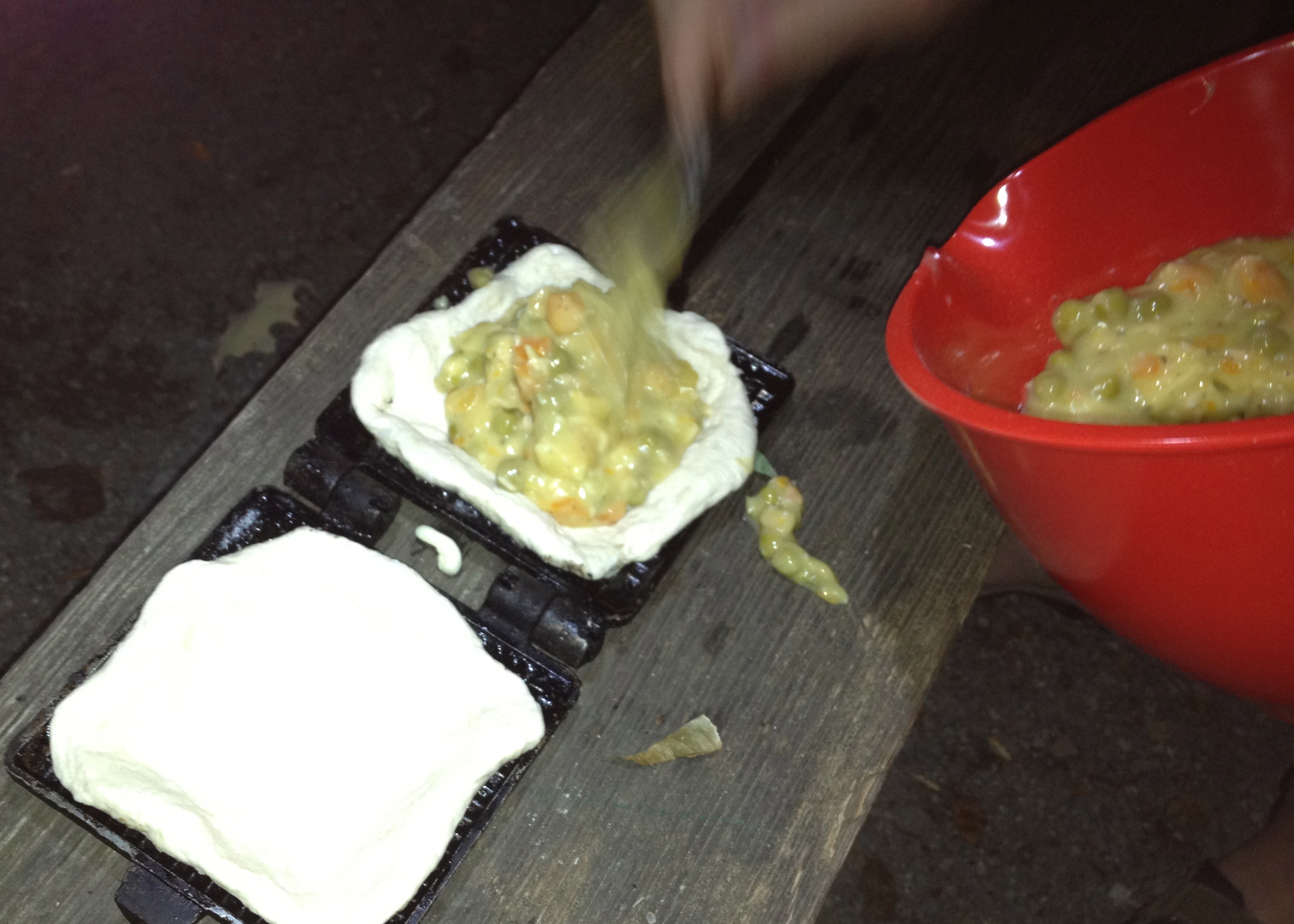 Scoop the filling to flattened biscuits that have been placed onto a buttered pie iron. Spread the biscuits just far enough that they will hit each other when you close the iron and seal.